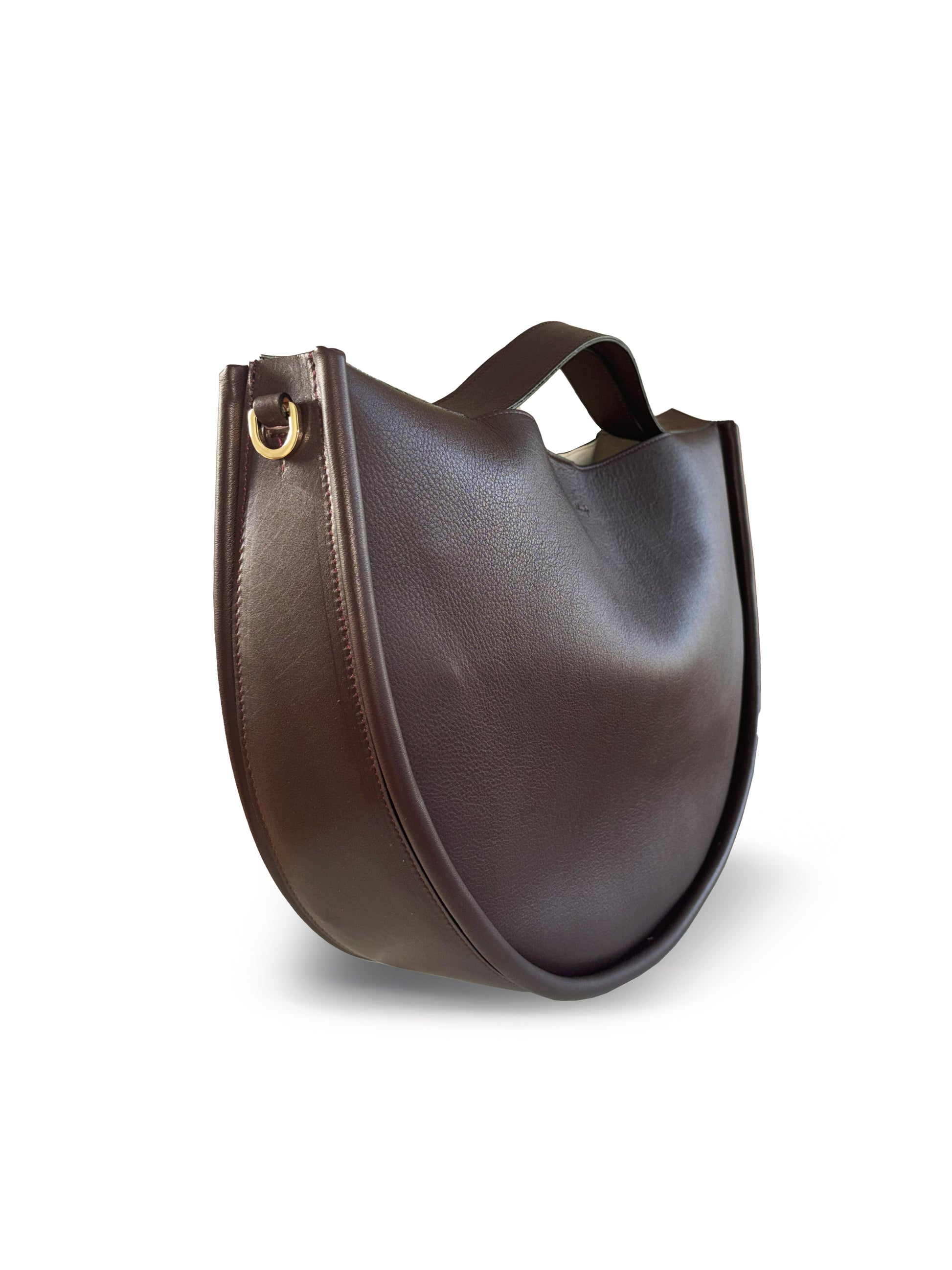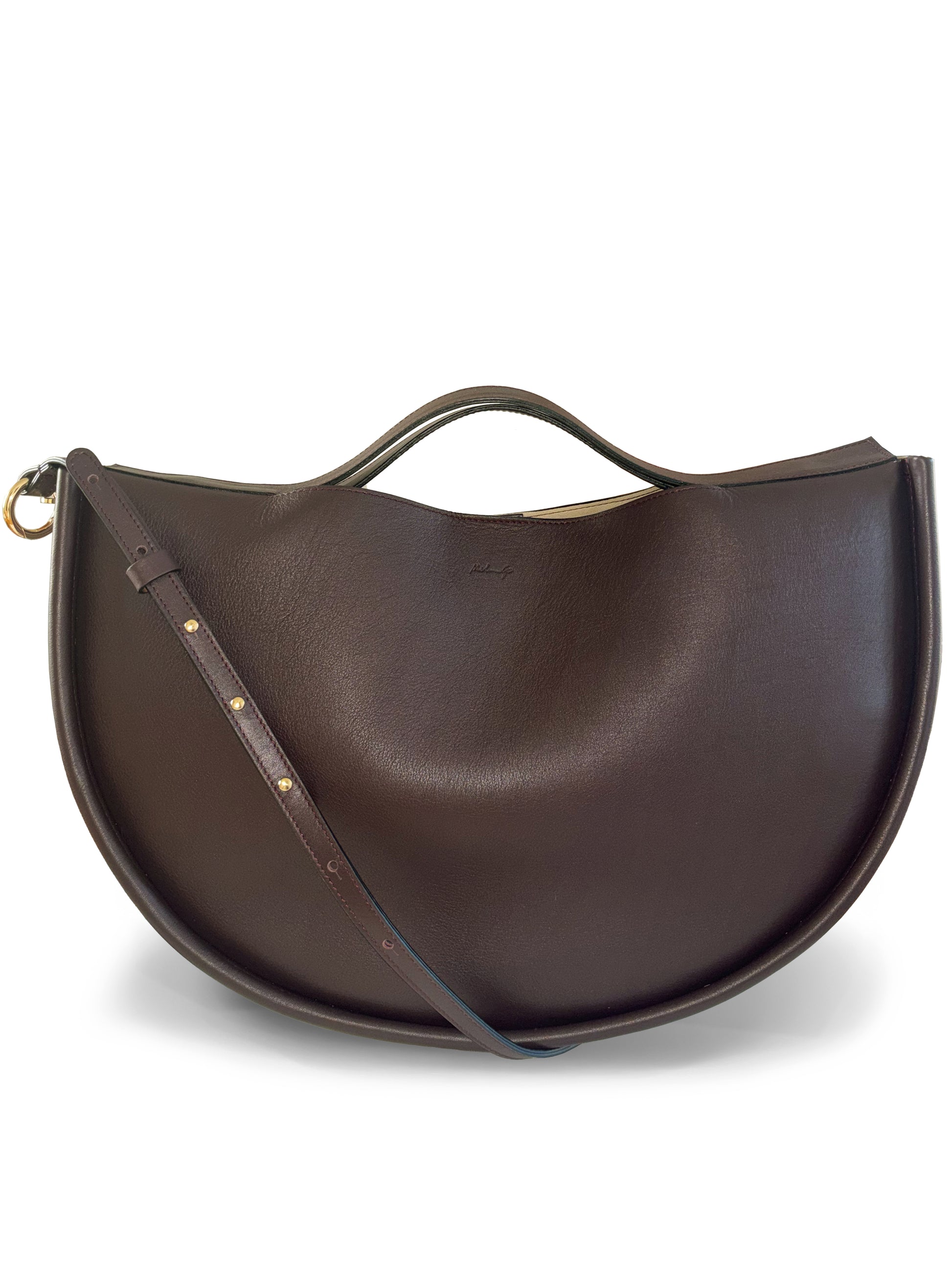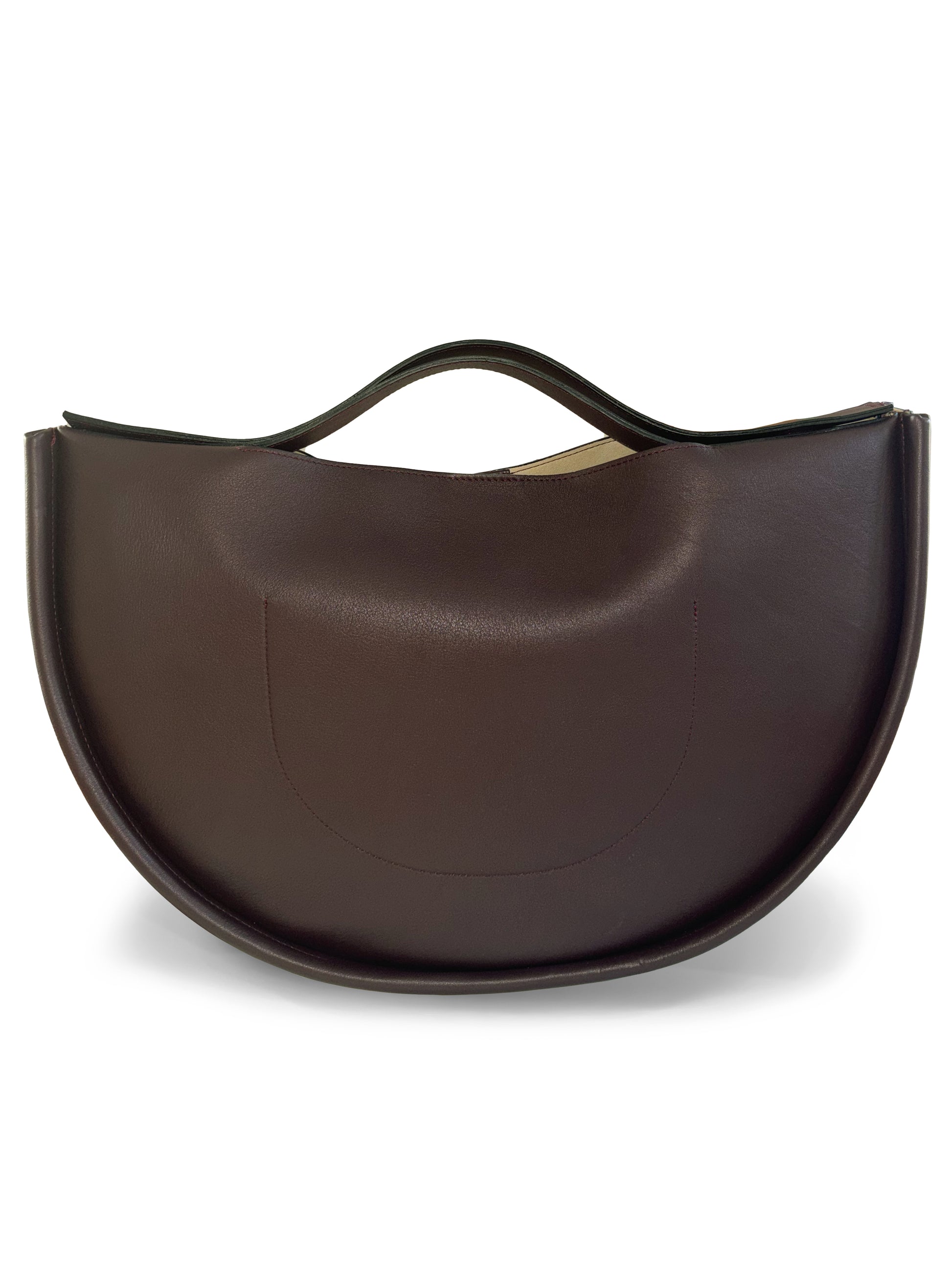 Egle è una borsa di grandi dimensioni dal carattere deciso. Ideale da portare a mano, esprime al meglio la sua forza scultorea in questa modalità.